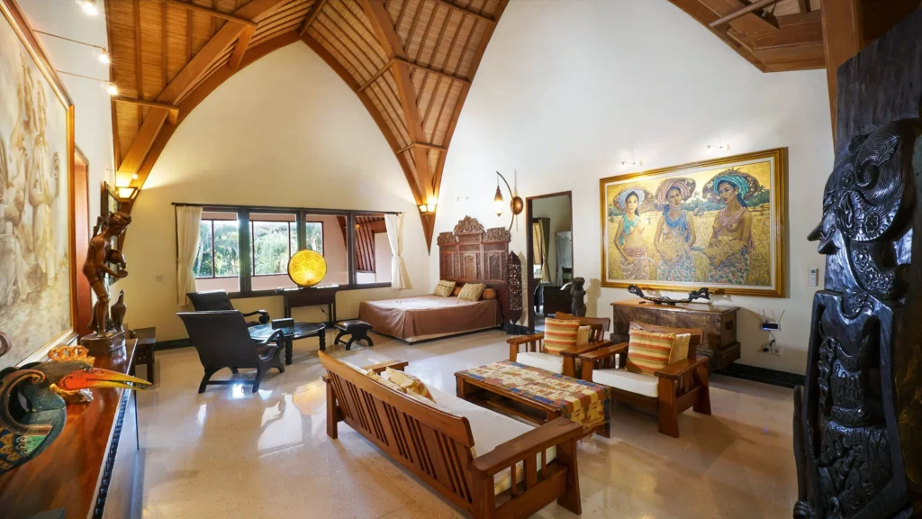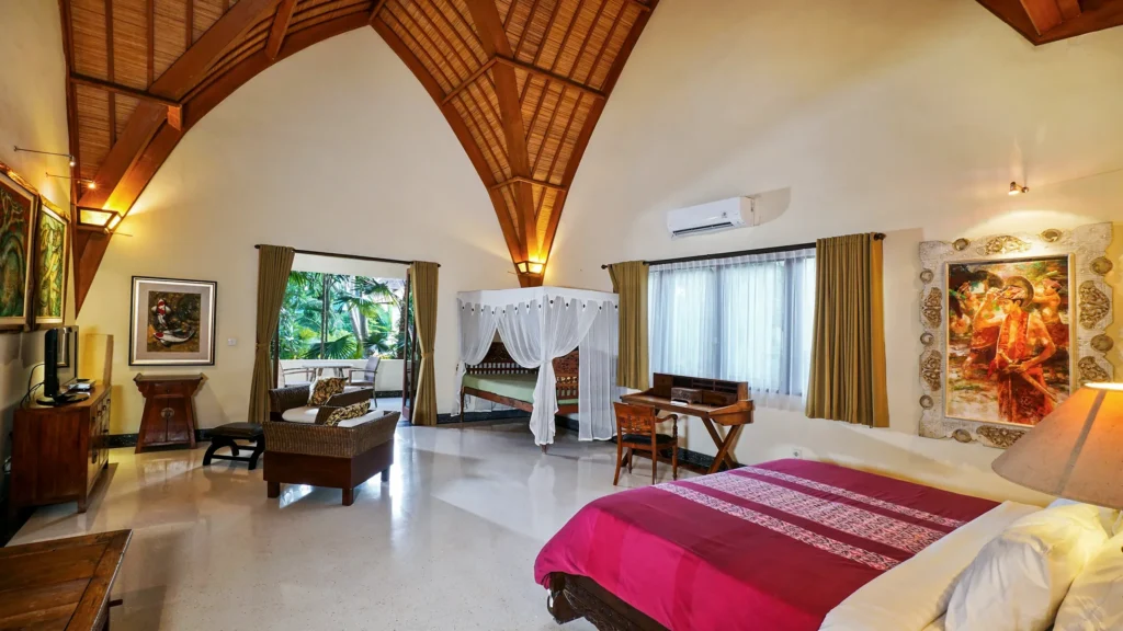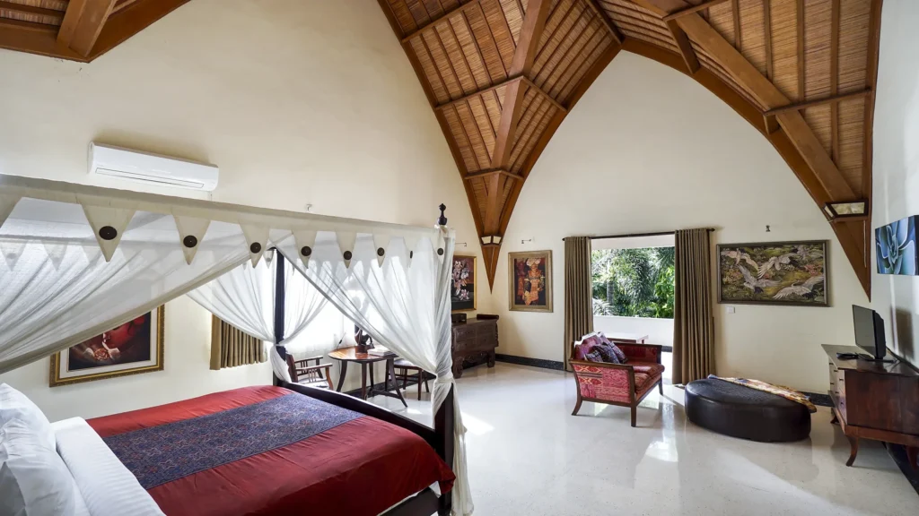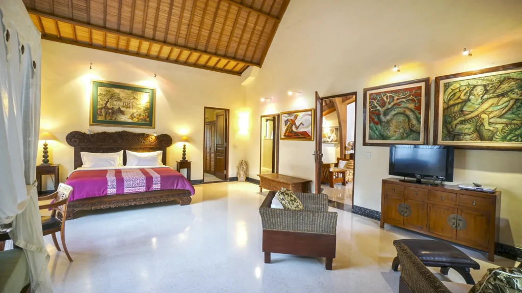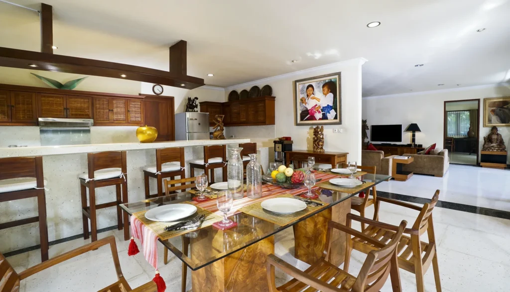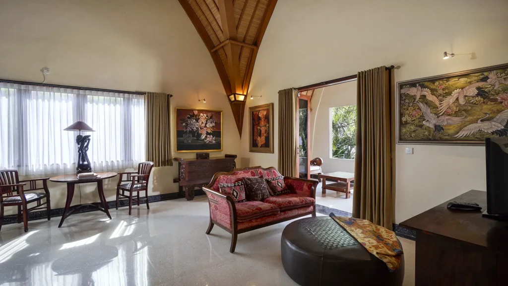 The living area at Villa Bali Maja is defined by its soaring lumbung-style thatched ceiling – a traditional Indonesian architectural form that transforms the space into something genuinely spectacular. Curated Balinese artwork lines the walls, the oversized sofa invites long lazy afternoons, and the 60-inch Smart TV with international channels handles movie nights. Set the mood with the Sonos sound system, whether it’s a sunset session by the pool or a relaxed evening in. Folding doors open the living room directly to the pool, merging indoor comfort with outdoor Bali living.