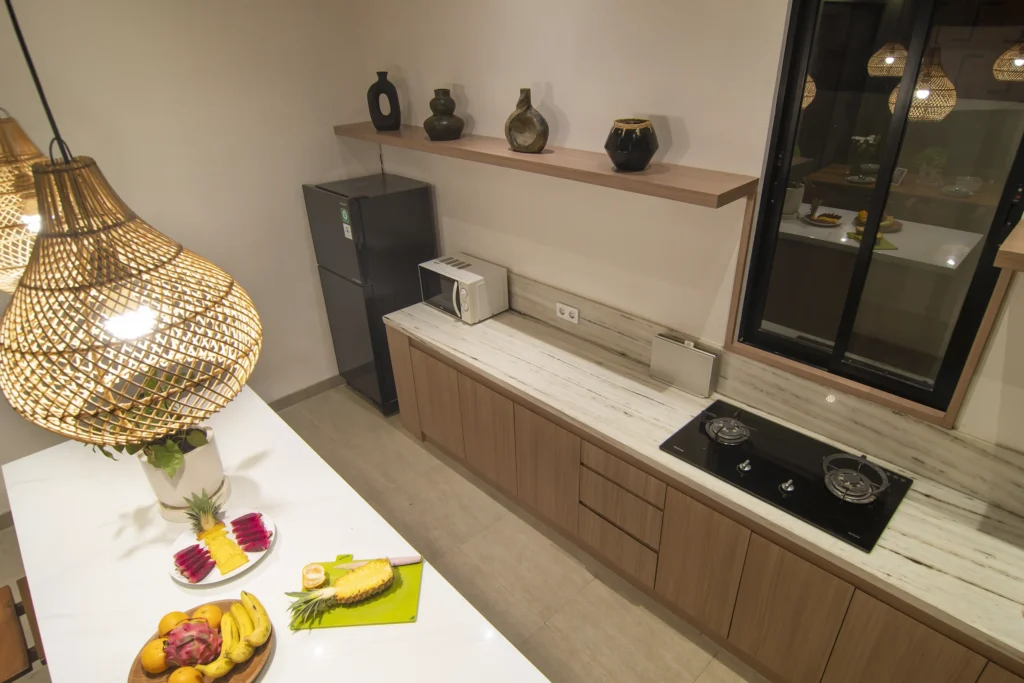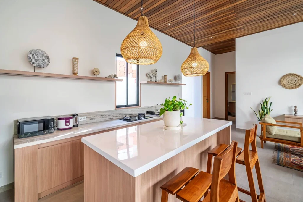 Fully equipped and genuinely usable. Stove, microwave, fridge-freezer, rice cooker, and a spacious island bar.